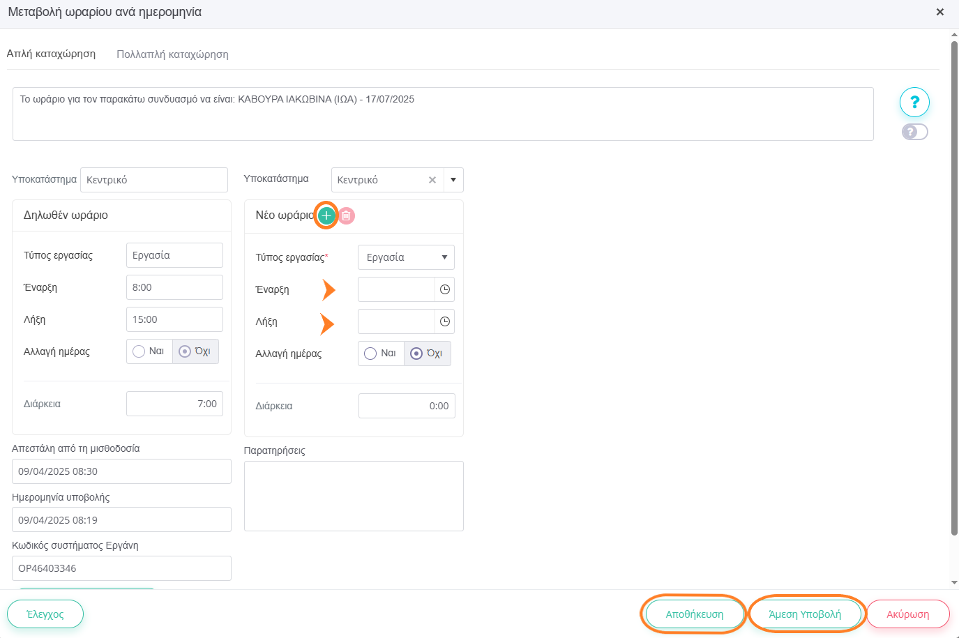 Αλλάξετε τις ώρες εργασίας συμπληρώνοντας τις νέες ώρες εργασίας σύμφωνα με την σύμβαση του υπαλλήλου